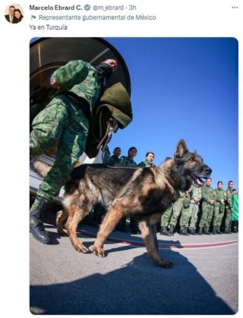 Añadió que el equipo mexicano ya fue recibido por el embajador de México en Turquía, José Luis Martínez, y en las próximas horas se trasladará directamente al lugar del terremoto para empezar a trabajar. El canciller detalló que el corazón del equipo son los 16 binomios caninos, especialmente entrenados para la emergencia inmediata que es el rescate de personas.
