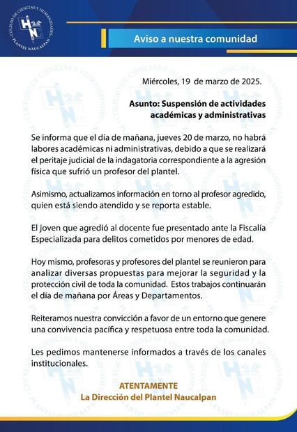 La dirección del plantel CCH Naucalpan, a través de un comunicado informó que el jueves 20 de marzo las actividades escolares y administrativas serán suspendidas, debido a la realización de trabajos de peritaje con motivo de la agresión que sufrió un maestro en las instalaciones.