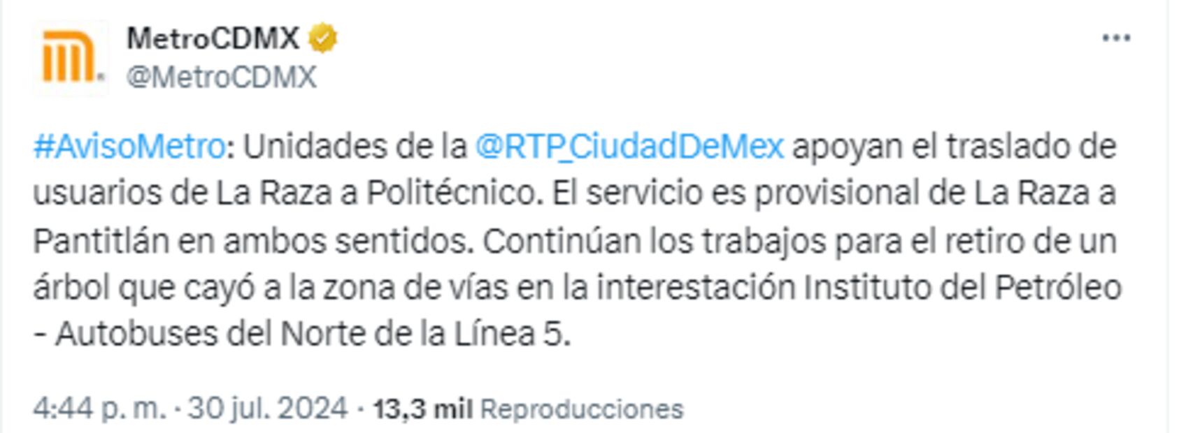 Ante el incidente, la cuenta del Metro CDMX en X dio a conocer que el servicio se dará de forma provisional de La Raza a Pantitlán en ambos sentidos, en cuanto el traslado de La Raza a la estación Politécnico se brindará con el apoyo de unidades RTP.