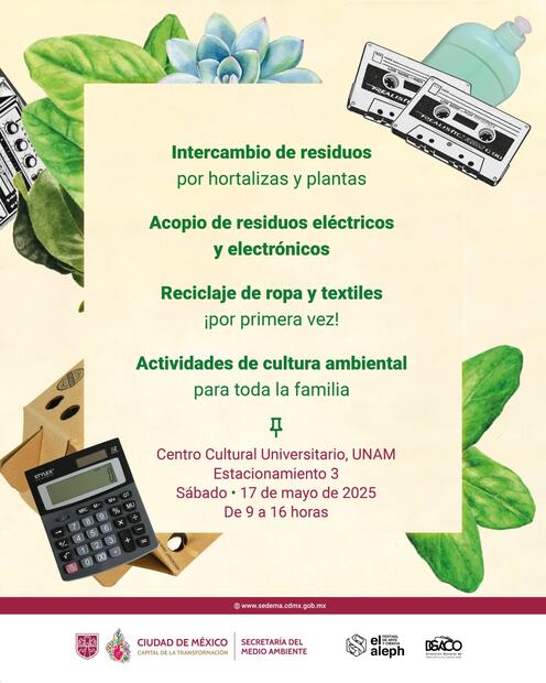 Este sábado 17 de mayo, el Gobierno de la Ciudad de México organiza la Mega Jornada de Reciclaje en el estacionamiento 3 del Centro Cultural Universitario (CU), desde las 9:00 hasta las 16:00 horas.