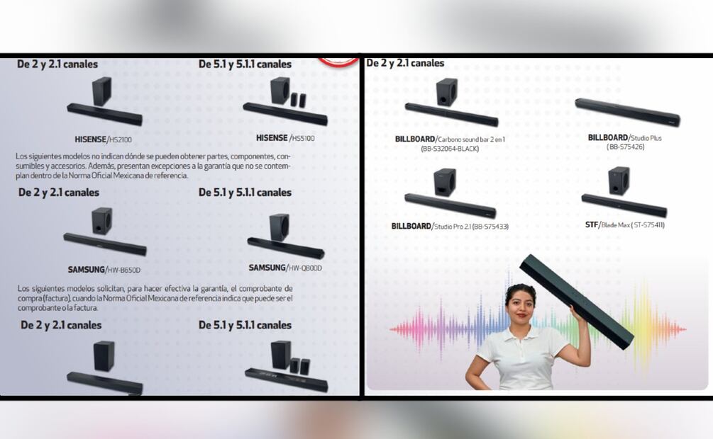 De acuerdo con Profeco, las siguientes barras de sonido no muestran en su información el nombre ni la dirección del establecimiento para hacer efectiva la garantía, ni un lugar donde se puedan obtener componentes, partes o accesorios, éstas son:
