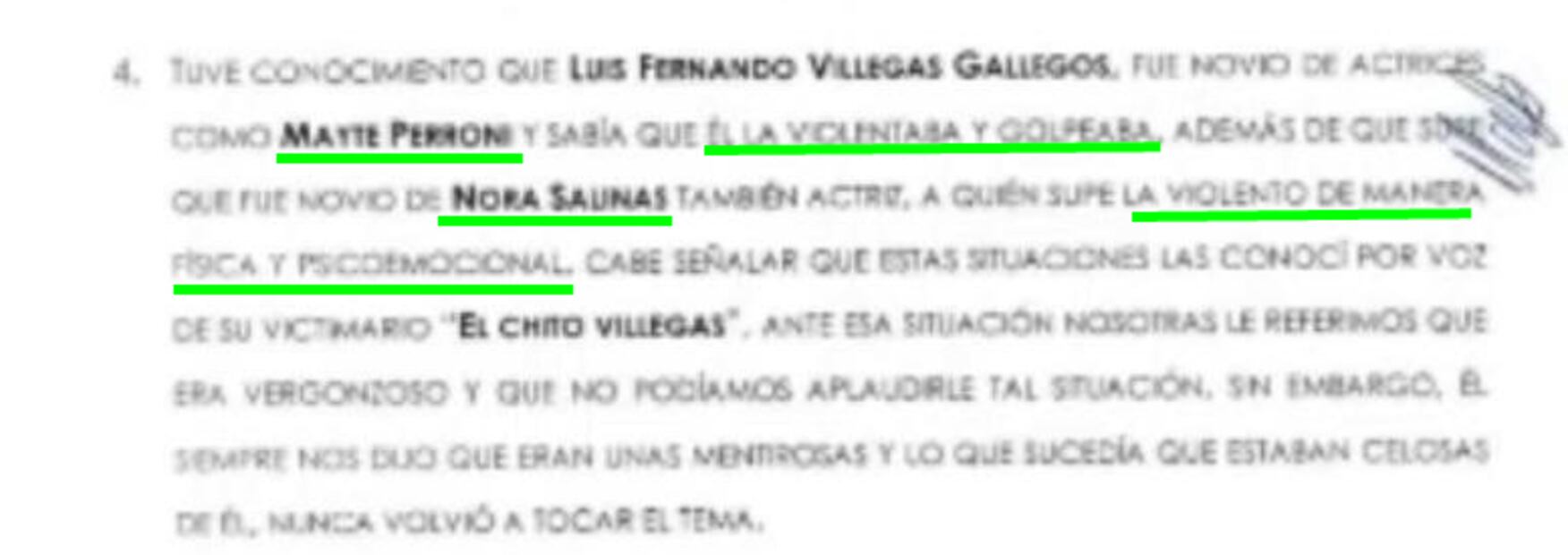 “Tuve conocimiento que Luis Fernando Villegas Gallegos fue novio de Maite Perroni y sabía que él la violentaba y golpeaba, además de que supe fue novio de Nora Salinas, a quien supe la violentó de manera física y psicoemocional, cabe señalar que estas situaciones las conocí por voz de su victimario El Chito Villegas”, manifestó la acusadora.