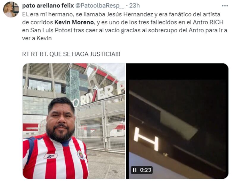 De manera inconstante desde diversas cuentas de X, se da a conocer al tercer muerto en el accidente del Rich: “Él era mi hermano, se llamaba Jesús Hernández y era fanático del artista de corridos Kevin Moreno y es uno de los tres fallecidos en el antro de San Luis, que se haga justicia”, solicitan de manera digital.
