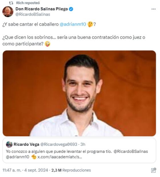 Luego de que un usuario de X, antes Twitter, etiquetara al dueño de TV Azteca diciéndole que el regiomontano podía subir el rating de La Academia, el Tio Rich no dejó pasar la oportunidad y este miércoles contestó la publicación en donde preguntó como caería la contratación del influencer.
