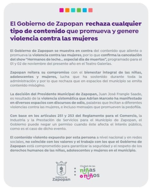 “El gobierno de Zapopan se muestra en contra del contenido que aliente o promueva la violencia en contra de las mujeres, por lo que confirma la cancelación del show ‘Hermanos de leche... especial del día de muertos’, programado para el 1 y 2 de noviembre del presente año en el Teatro Galería”.