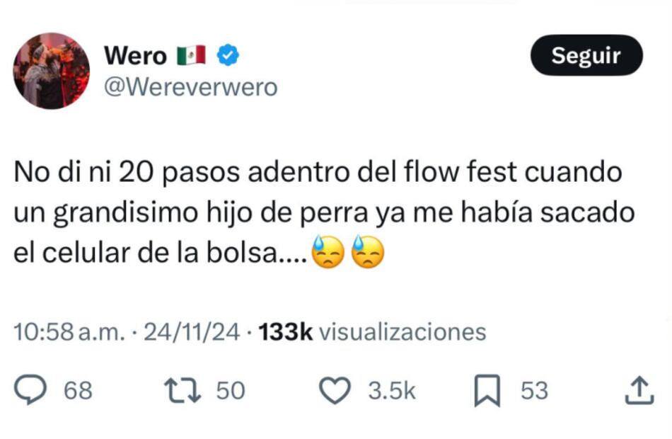 "No di ni 20 pasos adentro del flow fest cuando un grandisimo hijo de perra ya me había sacado el celular de la bolsa”, escribió el creativo en su perfil de X.