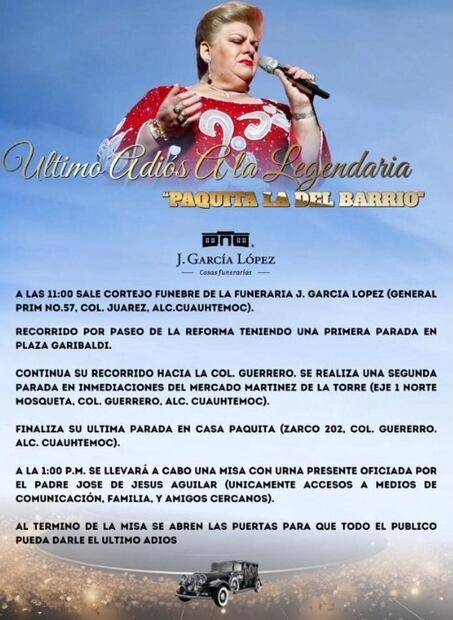 Pero antes, las cenizas de la cantante saldrán de la funeraria García López de la colonia Juárez este viernes 21 de febrero a las 11:00 horas con rumbo a la Plaza Garibaldi.