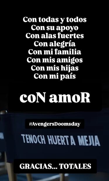 “Con todas y todos, con su apoyo, con alas fuertes, con alegría, con mi familia, con mis amigos, con mis hijas, con mi país, con amor. Gracias totales”, externó Huerta en sus redes sociales tras darse a conocer que forma parte del elenco de “Avengers: Doomsday”.
