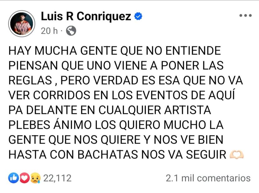 En post publicó: "Hay mucha gente que no entiende, piensan que uno viene a poner las reglas, pero la verdad es esa, que no va a haber corridos en los eventos de aquí pa delante, en cualquier artista, plebes ánimo los quiero mucho, la gente que nos quiere y nos ve bien hasta con bachatas nos va seguir".