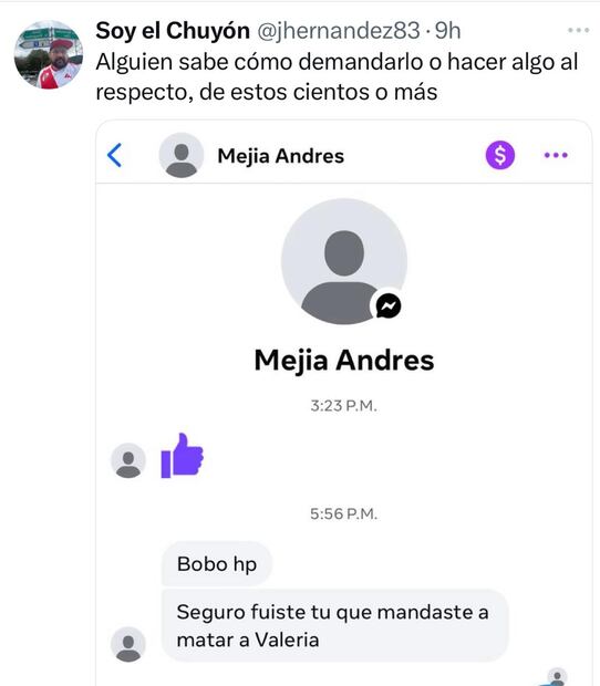 "Seguro fuiste tú que mandaste matar a Valeria", escribió Mejia Andrés.