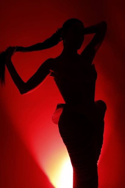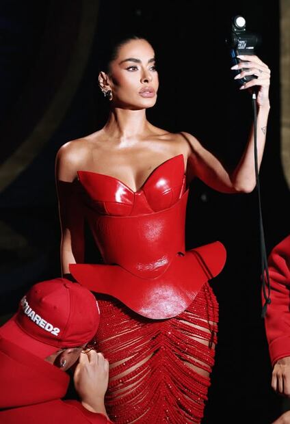 "El rojo no es solo pasión, es la historia de una mujer que aprendió a arder para brillar. Creamos este look con un corset en piel roja, con un corte peplum que define la silueta y una falda lápiz bordada a mano con más de 20 mil cuentas bordadas una a una...", indicó la creadora.