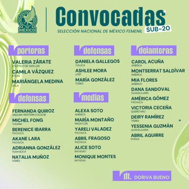 JUGADORAS CONVOCADAS A LA SELECCIÓN MEXICANA FEMENIL SUB-20