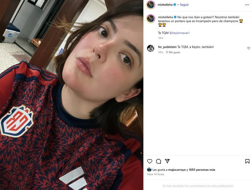 "No que nos iban a golear!? Nosotros también tenemos un portero que es tricampeón pero de champions 🏆 🏆🏆 Te TQM @keylornavas1". Fue el mensaje que escribió Mishelle.