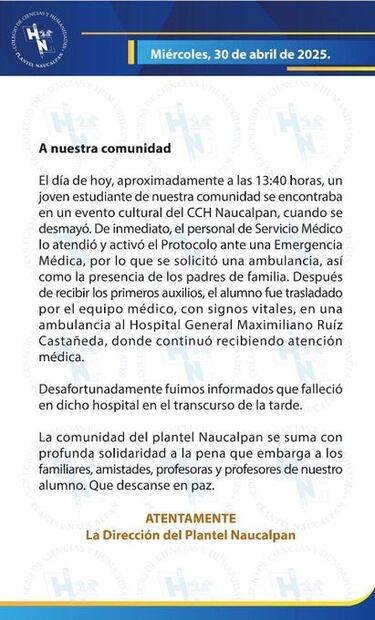 “El día de hoy, aproximadamente a las 13:40 horas, un joven estudiante de nuestra comunidad se encontraba en un evento cultural del CCH Naucalpan, cuando se desmayó. De inmediato, el personal de Servicio Médico lo atendió y activó el Protocolo ante una Emergencia Médica, por lo que se solicitó una ambulancia, así como la presencia de los padres de familia. Después de recibir los primeros auxilios, el alumno fue trasladado por el equipo médico, con signos vitales, en una ambulancia al Hospital General Maximiliano Ruíz Castañeda, donde continuó recibiendo atención médica”.