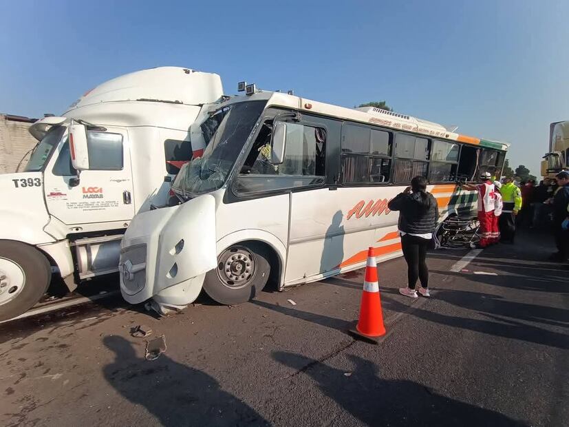 ESTADO DE MÉXICO.- El choque de un camión de transporte público contra un tráiler, en el kilómetro 42 del Circuito Exterior Mexiquense, dejó un saldo de 12 pasajeros lesionados, entre ellos un hombre quien quedó prensado.