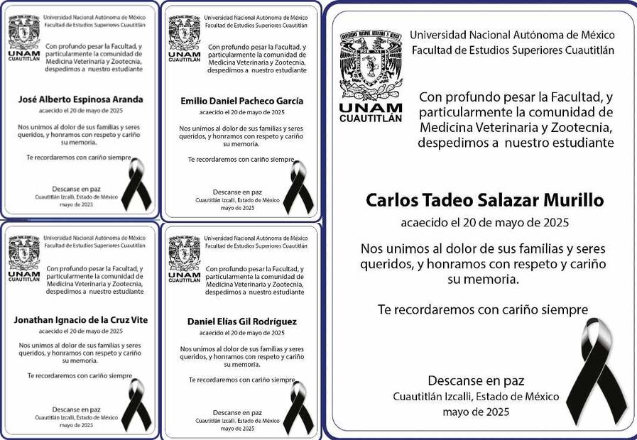 "Con profunda tristeza, la Facultad de Estudios Superiores Cuautitlán lamenta informar el fallecimiento de cinco estudiantes de nuestra comunidad, quienes perdieron la vida al accidentarse en el vehículo en el que viajaban el día de ayer 20 de mayo de 2025 en las inmediaciones del campus.