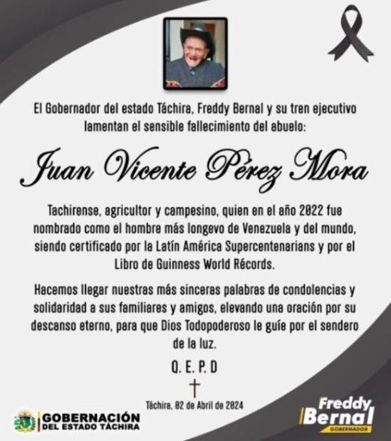 El ‘tío Juan’, como era popularmente conocido, nació el 27 de mayo de 1909 y, desde 2020, cuando esperó el Guinness, que se dio a conocer el 17 de mayo de 2022. En mayo pasado, cuando celebró su último cumpleaños, recibió felicitaciones del mandatario venezolano, Nicolás Maduro, de Bernal y de varios dirigentes de la oposición.