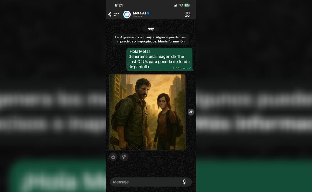 Los pasos a seguir son muy sencillos, comenzaremos entrando al chat de Meta AI para pedirle lo siguiente: "Hola Meta, genérame una imagen de The Last Of Us por favor". En caso de que la imagen que te haya generado no sea completamente de tu agrado, solicítale que te genere otra con las especificaciones que desees.