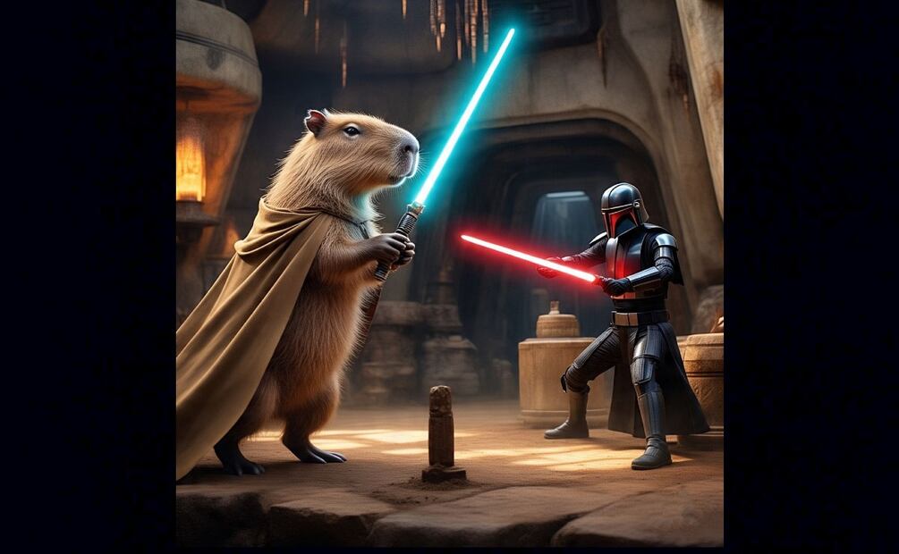 El resultado de esta fusión de estos universos nos dejó impactados, la estructura del Capibara no cambia mucho, sin embargo, la acción de sus imágenes te dejarán impactado. Mantiene su gran pelaje, su característica mirada y sus dientes sobresalientes que lo hacen tan tierno, además quedó demostrado que el Capibara sería un auténtico Jedi.